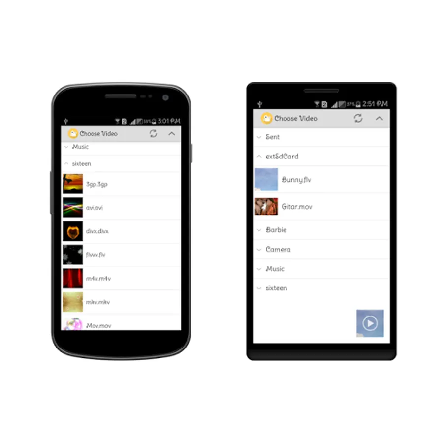 -Scans all videos inside your device using custom Video Chooser (including those not shown in device built-in video player)