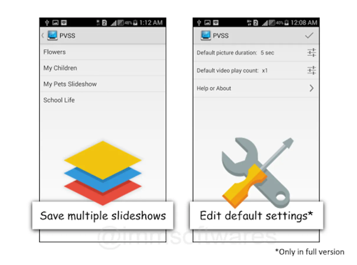 This app is designed for displaying slideshows on Android devices including phones and tablets running Android 3.0 and above (Full version); Android 4.0 and above (Preview version).