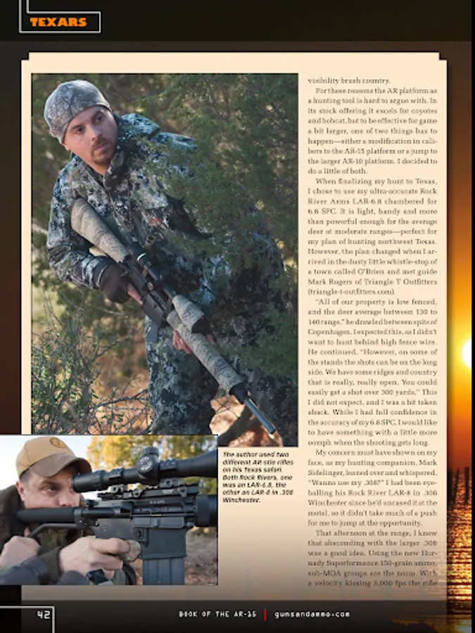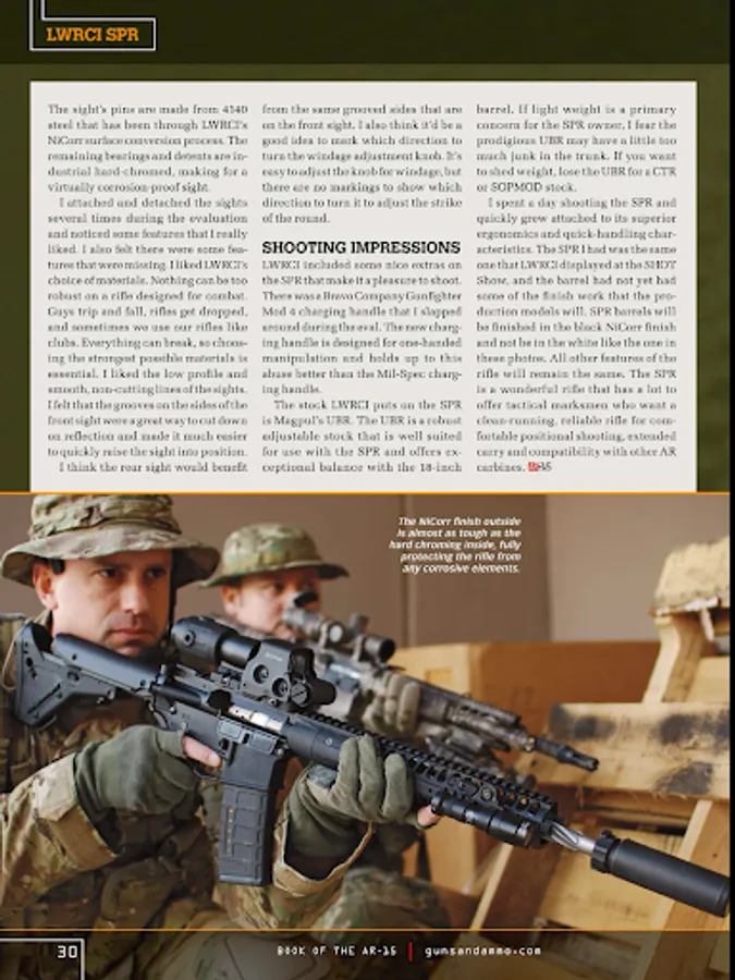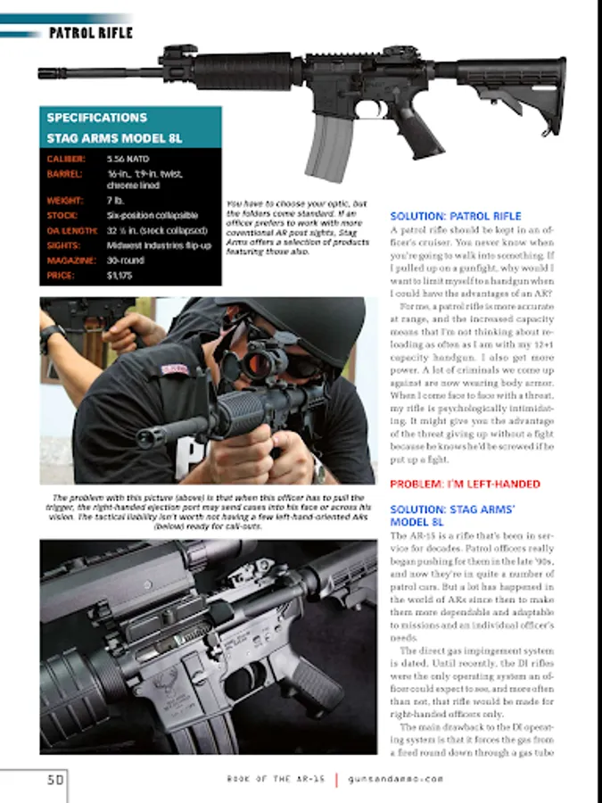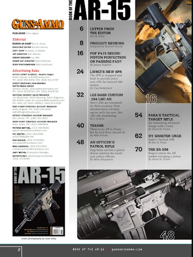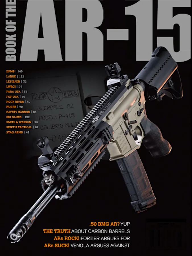 Guns & Ammo’s Book of the AR-15 is a quarterly publication for the AR-type rifles. Enthusiasts will find a broad mix of subjects from Do-It-Yourself articles to skill development for all types of competitive shooting. In every issue, readers will share the experiences of experienced contributors that hunt everything including alligators, hogs, whitetails, mule deer, prairie dogs, elk and coyotes. A complete product round up is featured in every issue to arm the AR consumer with straightforward analysis and conclusive opinions. We investigate every aspect of the AR-15’s history, the culture, and fearlessly discuss the social and political issues of interest to responsible AR-15 gun owners. Every issue is complete with a final article that challenges the reader with a test or provides a unique form of entertainment. All this and more is heavily illustrated with detailed photography and technical analysis that can’t be read in any other gun magazine.