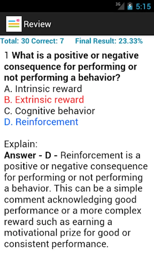 - Test mode: review your exam questions with answers and explanations;