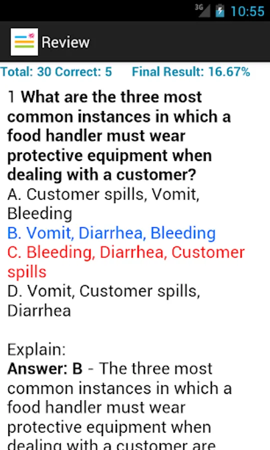 - Test/Exam mode: review your exam questions with answers and explanations;