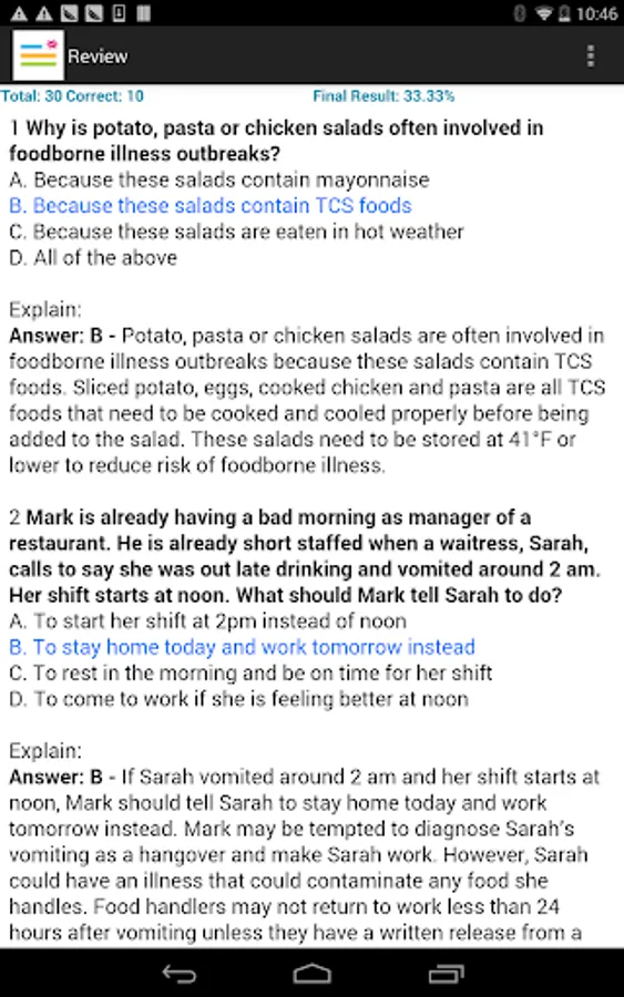 Food Safety Test Prep allows you to prepare the ServSafe Food Protection Manager Certification Examination, the American Food Safety Institute(AFSI) Food Manager Certification(FMC) exam, and the National Registry of Food Safety Professionals(NRFSP) Certified Food Safety Professional Examination on the go. With its exclusive intuitive and elegant UI, not only can you learn the knowledge for the test and get the serious exam experience, but also with joy and incredible flexibility. With the app, you can set your own pace and practice anytime you want, anywhere you want, get instant feedback and learn something immediately to get yourself better prepared for the test. Among many cool features, the most useful one is to allow you concentrating on your weakness which is way more efficient than the traditional way of study.