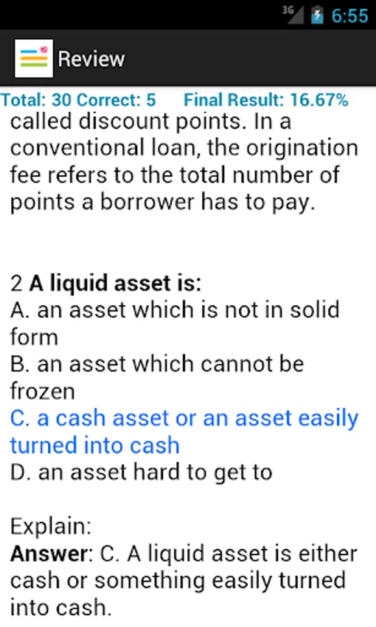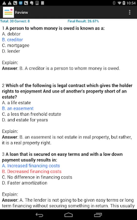 - Test/Exam mode: review your exam questions with answers and explanations;