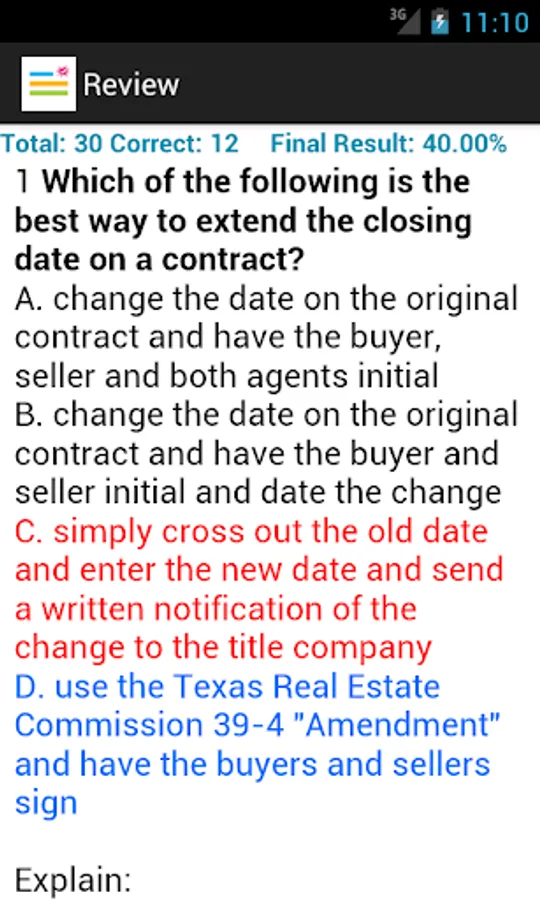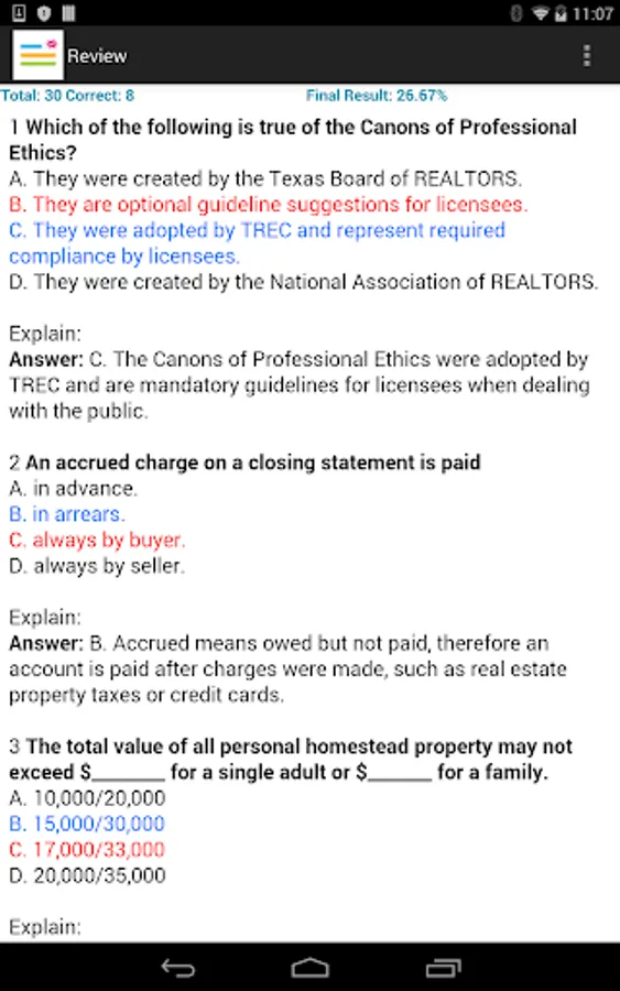 - Test mode: review your exam questions with answers and explanations;
