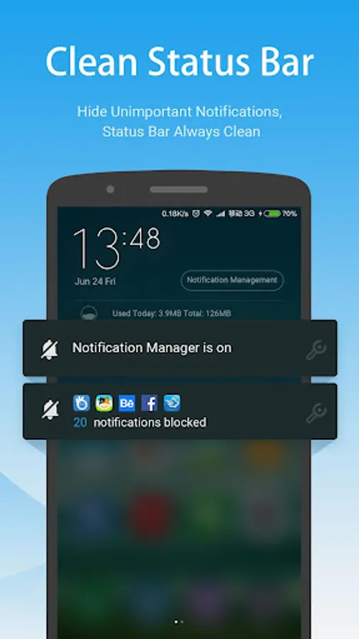 Notification Manager is a plugin belongs to All-In-One Toolbox. It is designed to bulk manage app notification messages from notification bar in an easy and fast way. It allows you to show important notifications and ignore annoying unnecessary notifications. Blocked messages will be hidden together in one place for later check. In this way, you can keep phone notification bar in a cleaner and tidy status.