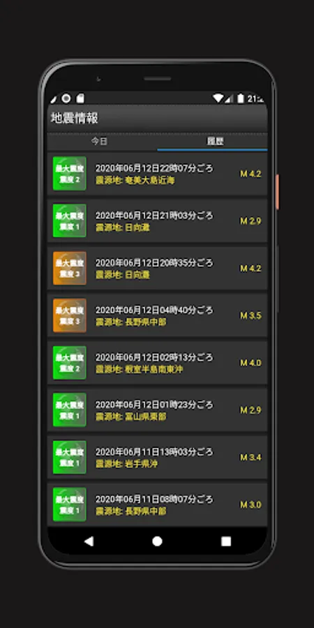 今現在または過去発生した地震情報が一覧に表示されます。