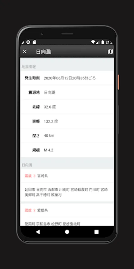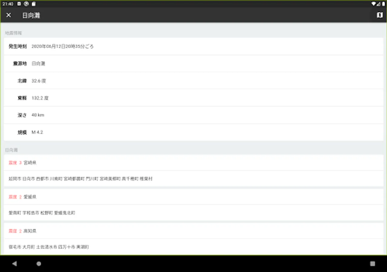 一覧をタップすると、地震詳細情報が表示されます。