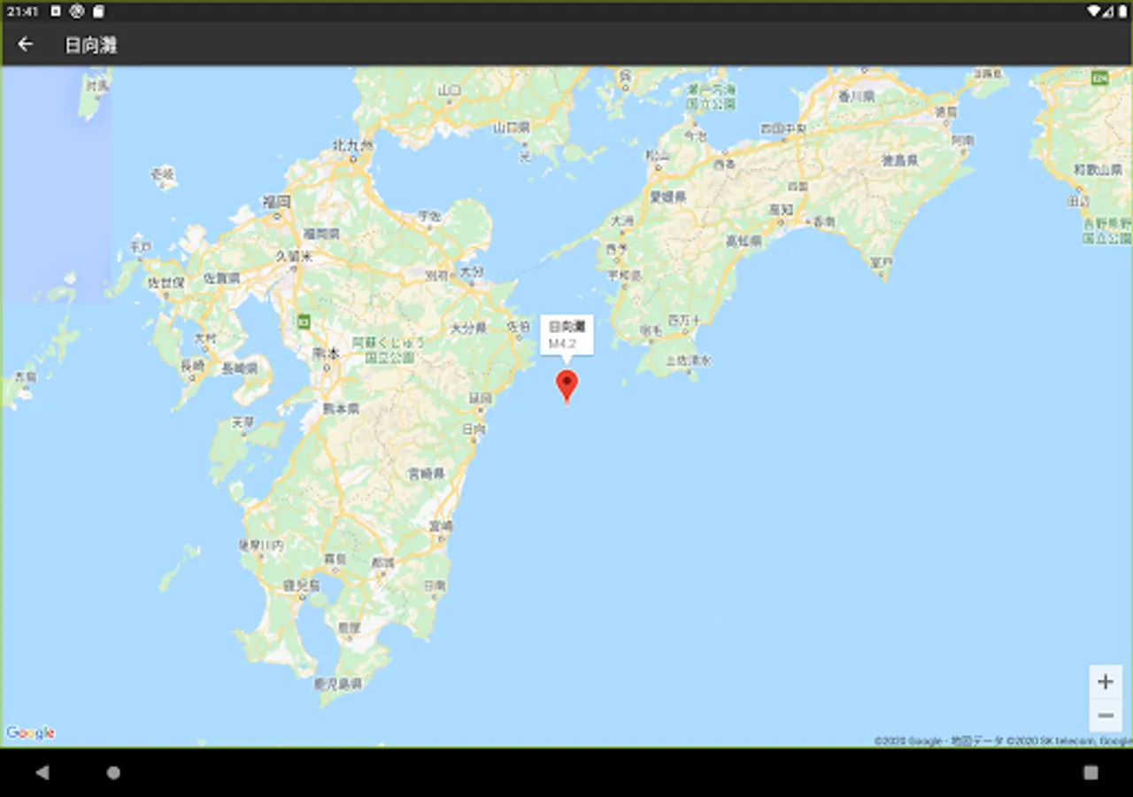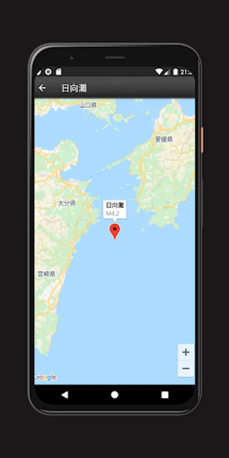 「地図へ」ボタンをタップすると、該当の震源地をマップで表示します。