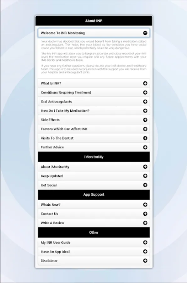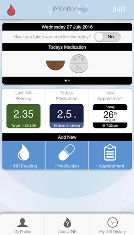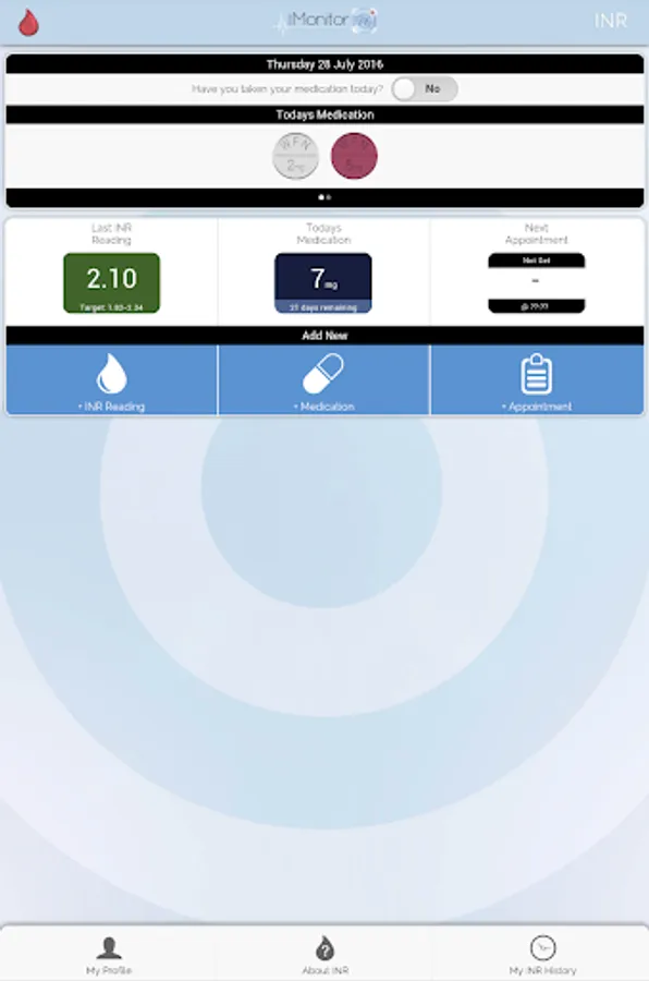 Entering information into My INR is a manual process and must be carried out with accuracy. Please ensure that all information entered is correct and in line with the INR readings, prescribed medication, and guidance that you receive from your GP, clinic or physician. This app is designed to be used only in conjunction with the support that you receive and should not be used as a method of self-prescribing medication. By downloading this app you are agreeing to our terms and conditions, and our disclaimer of its use, which is found on our website - www.imonitormy.com.