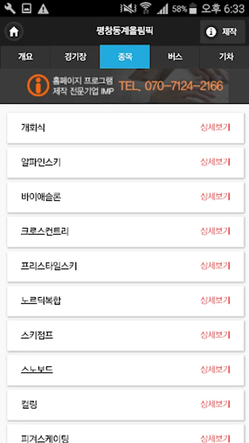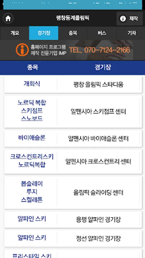 또한 종목별로 경기장을 목록화 하여 필요한 종목의 경기장을 찾아가는 정보를 제공합니다.
