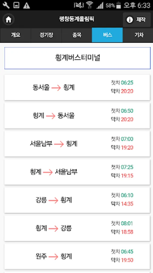 횡계버스터미널, 진부공용버스정류장, 장평버스터미널, 강릉버스터미널 정보를 이용하여