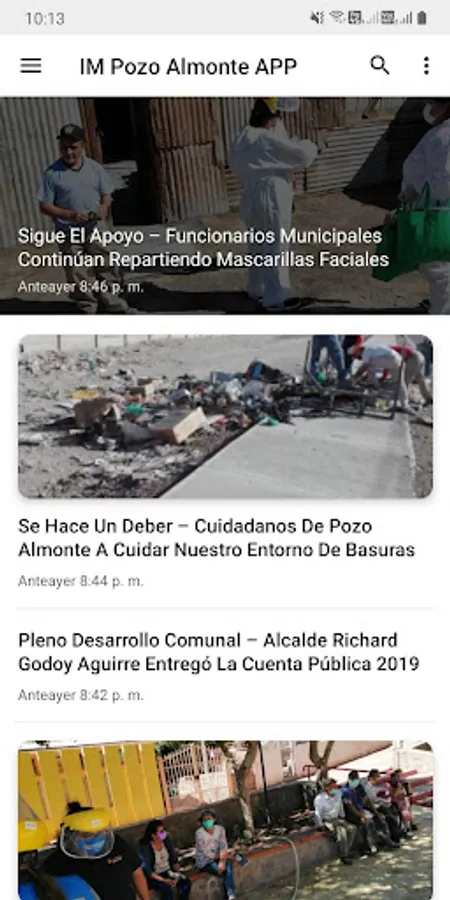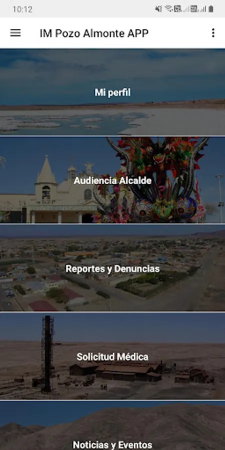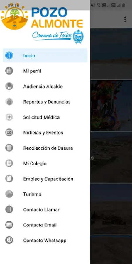 The Pozo Almonte IM App is a communication and information tool between the municipality and the residents. In its version 1.0 it includes the following functionalities: My profile, Mayor Audience, Reports and Complaints, Medical Request, News and Events, Garbage Collection, My School, Employment and Training, Tourism, Call Contact, Email Contact, Whatsapp Contact
