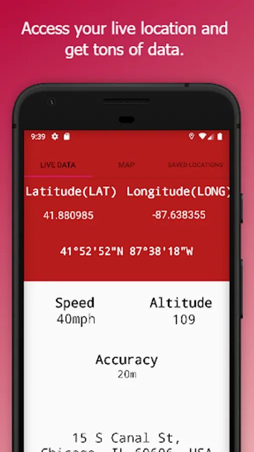 Access your location results including your coordinates, accuracy, altitude, address, and speed.