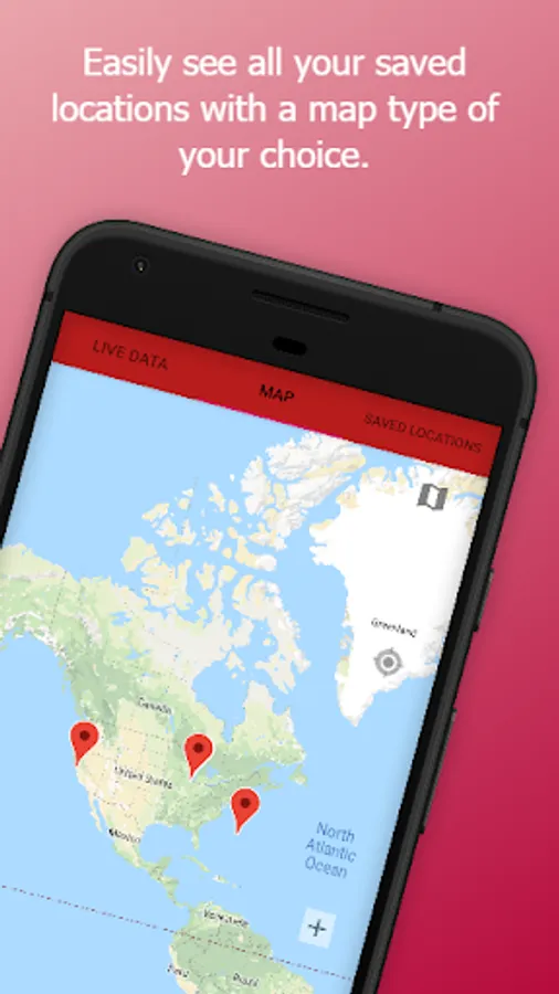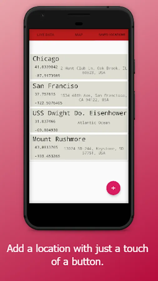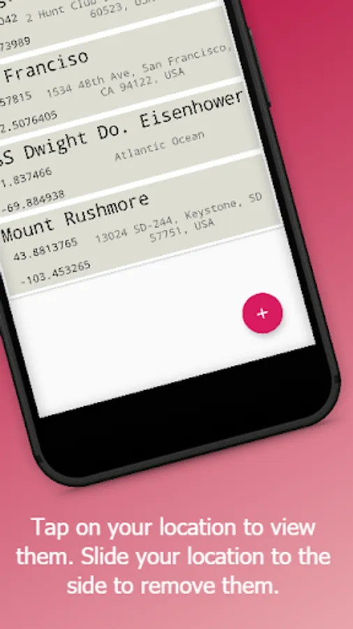 Create a list of GPS Coordinates and tap on them to access them on a map. Swipe your location to remove them.