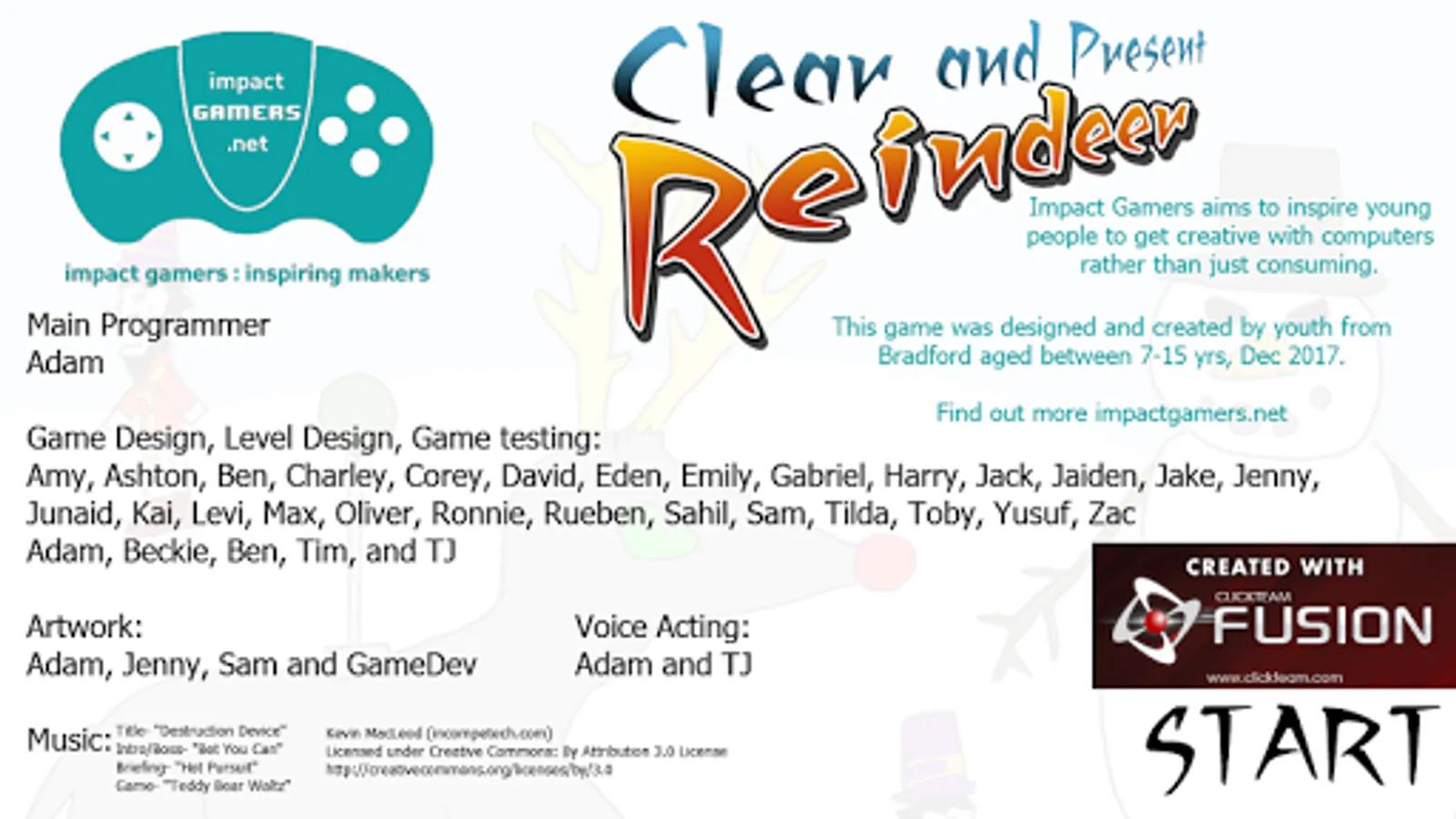 Game design and all levels were made by young people 7-15yrs at Impact Gamers in Bradford using Clickteam Fusion.