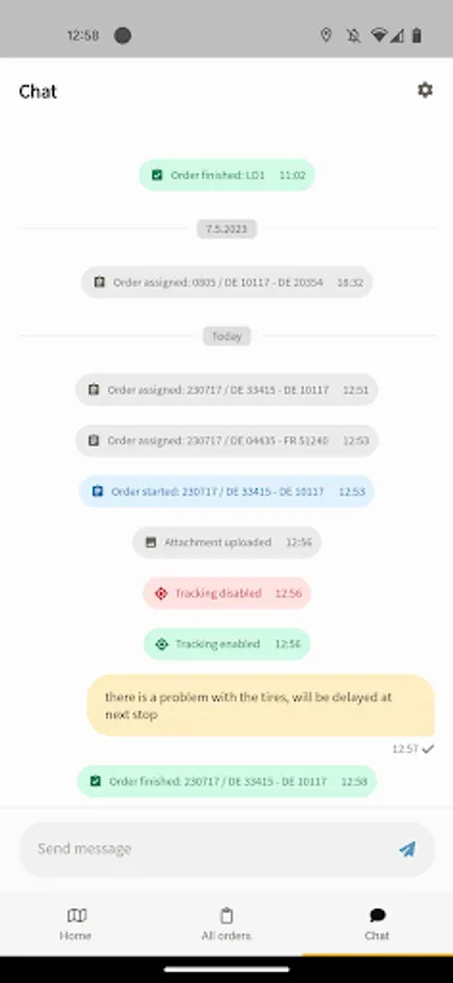 Drivers are able to update the order status and activities at every stop (e.g., start loading, finished loading, refuelling, resting, etc.) You can also document waiting times with GPS location as evidence.