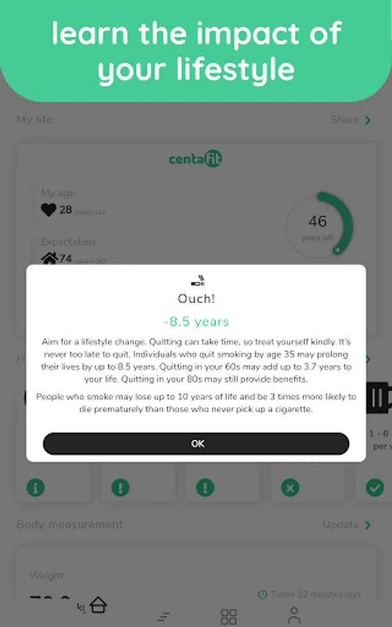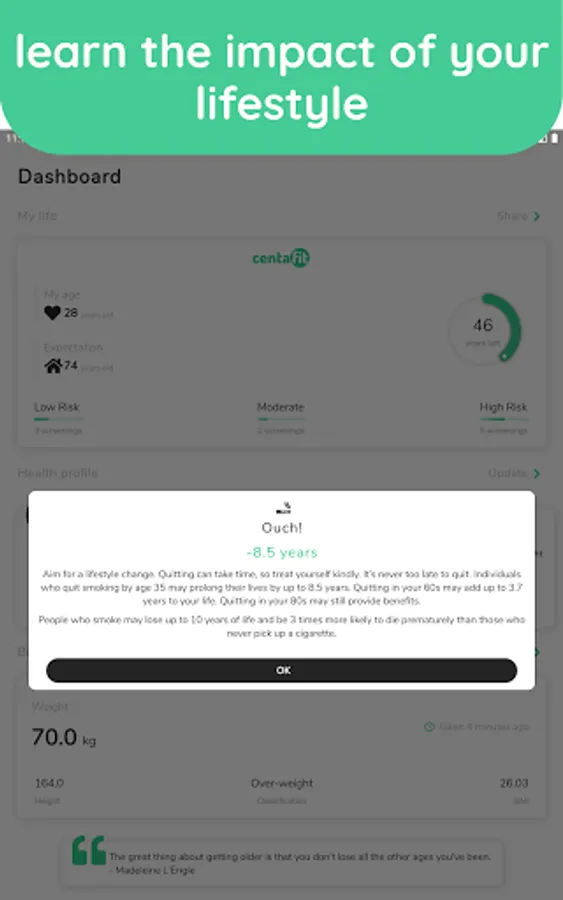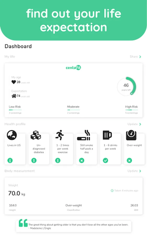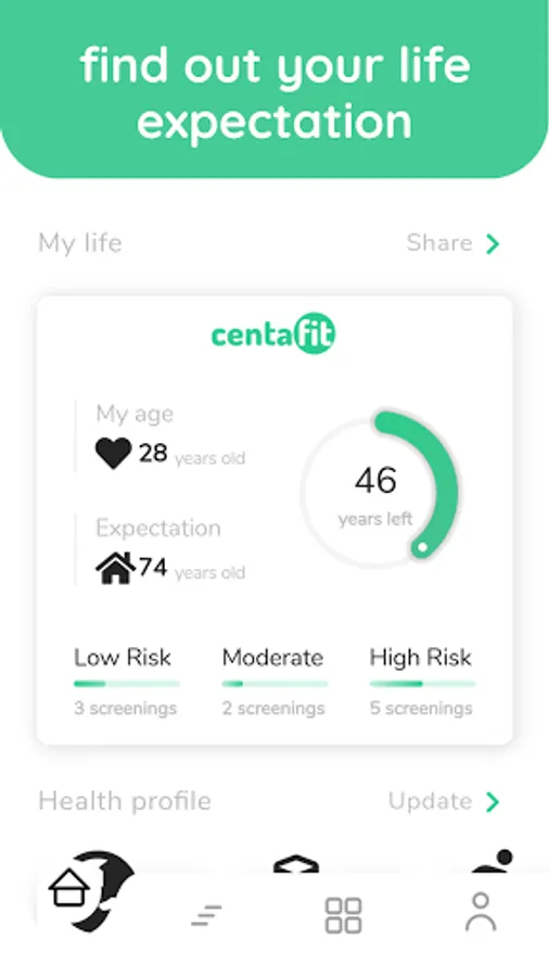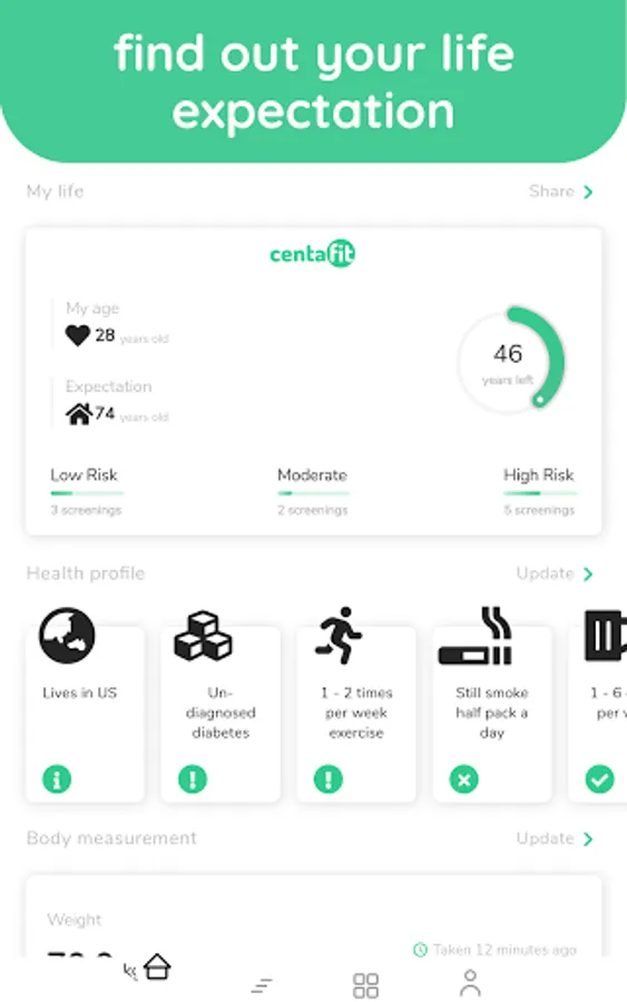 So, are you ready to live longer and feel better? Download Centafit: Health Check, Screening, and Life Expectancy and start understanding your health and identify your risks before it's too late.
