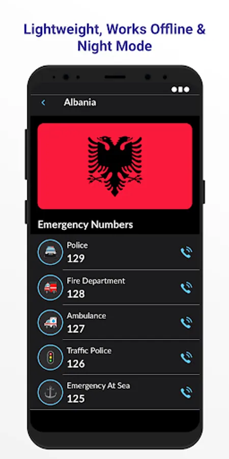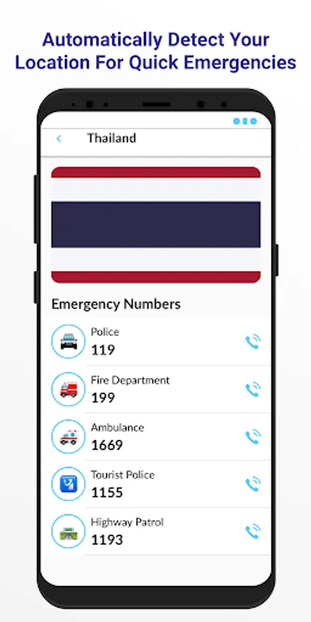 The app detects your current location and immediately shows the specific emergency phone numbers for that country.