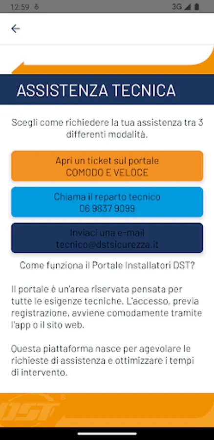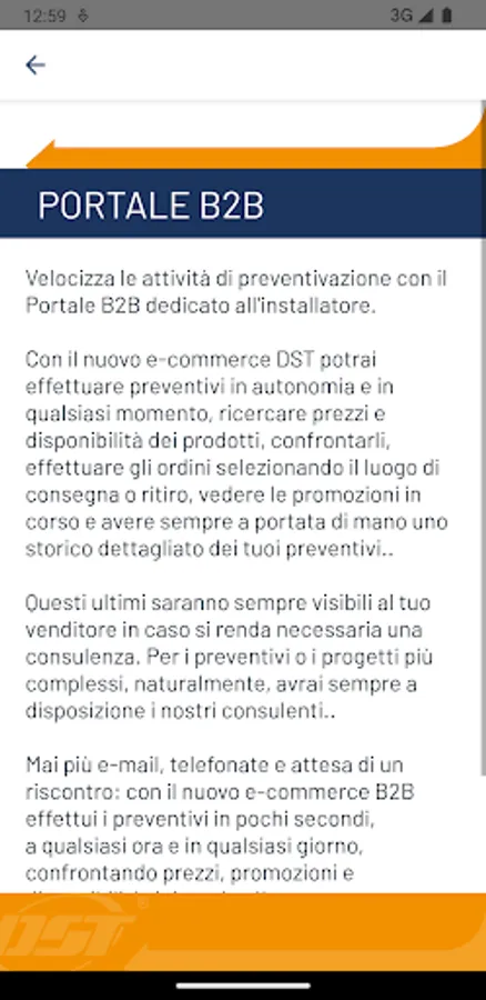 DST is a company that deals with the assistance and sale of security systems - CCTV, Burglar Alarm, Fire Alarm, Access Control - to the installer. Through the "DST" application, the company offers an alternative way to communicate with its customers by notifying promotions, news, training courses and providing an innovative tool for managing assistance. Through the app, the installer can in fact chat in real time with the DST virtual assistance service for immediate resolution of problems.