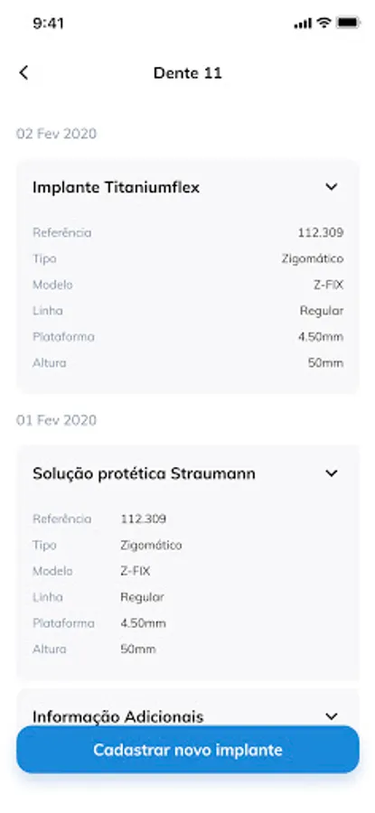 Implant File allows dentists to store and query information about implants performed on their patients. In addition, it is possible to consult the implants of patients attended by other dentists.