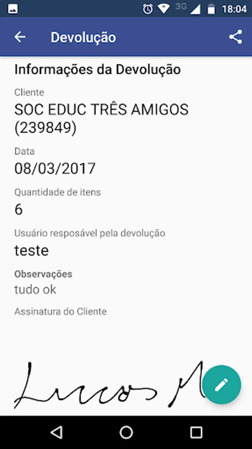Returns: Returns carries books using the camera as a bar code reader. At the end of the return, you requested the digital signature of the customer. This process can be shared via email or Whatapp.