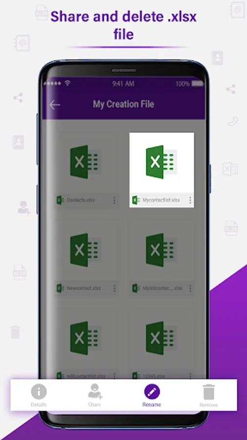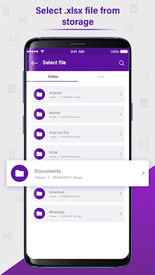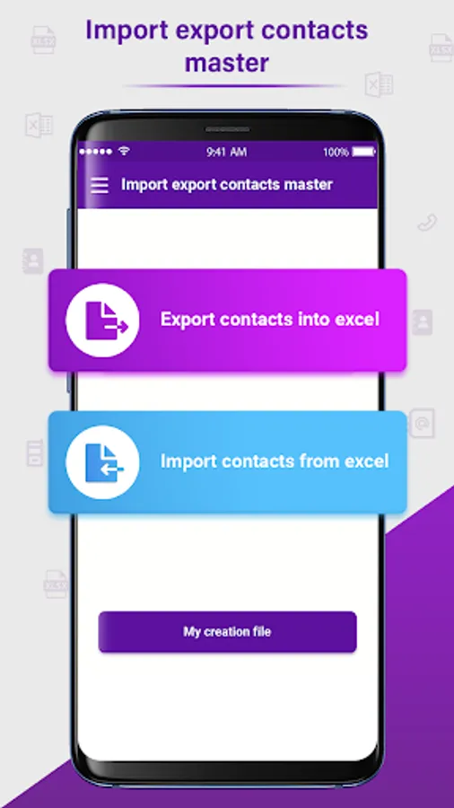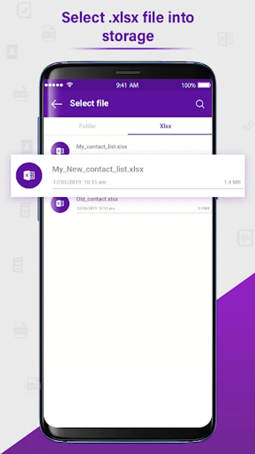Select an excel file from the phone memory and select import. Contacts will be saved in the contact list automatically.
