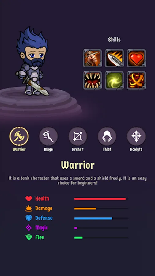 You start as an apprentice and you can choose among five different classes: Warrior, Mage, Archer, Thief and Acolyte!
