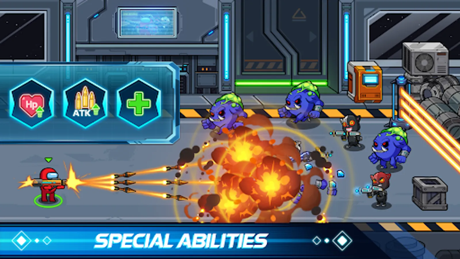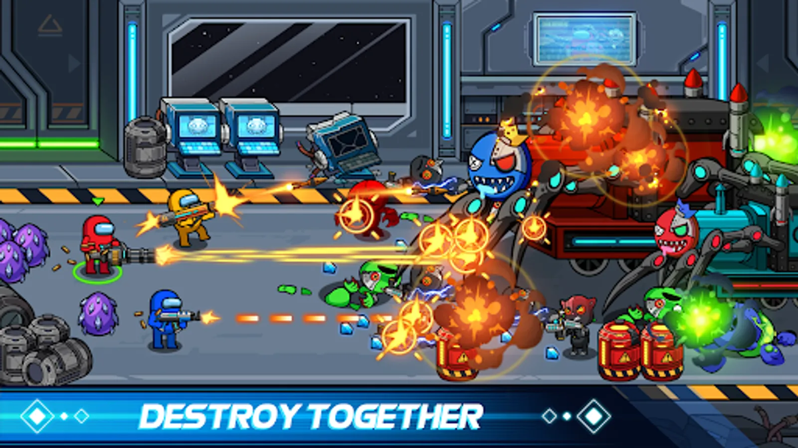 Help! Help! Help! Omg! Crewmates were chased! Chuu Chuu and monsters broke into your spaceship and ruined your team’s cheerful party. It’s time for Imposters to strike, show gun shooting skills, and give these ferocious monsters a memorable lesson in this bloody battle.