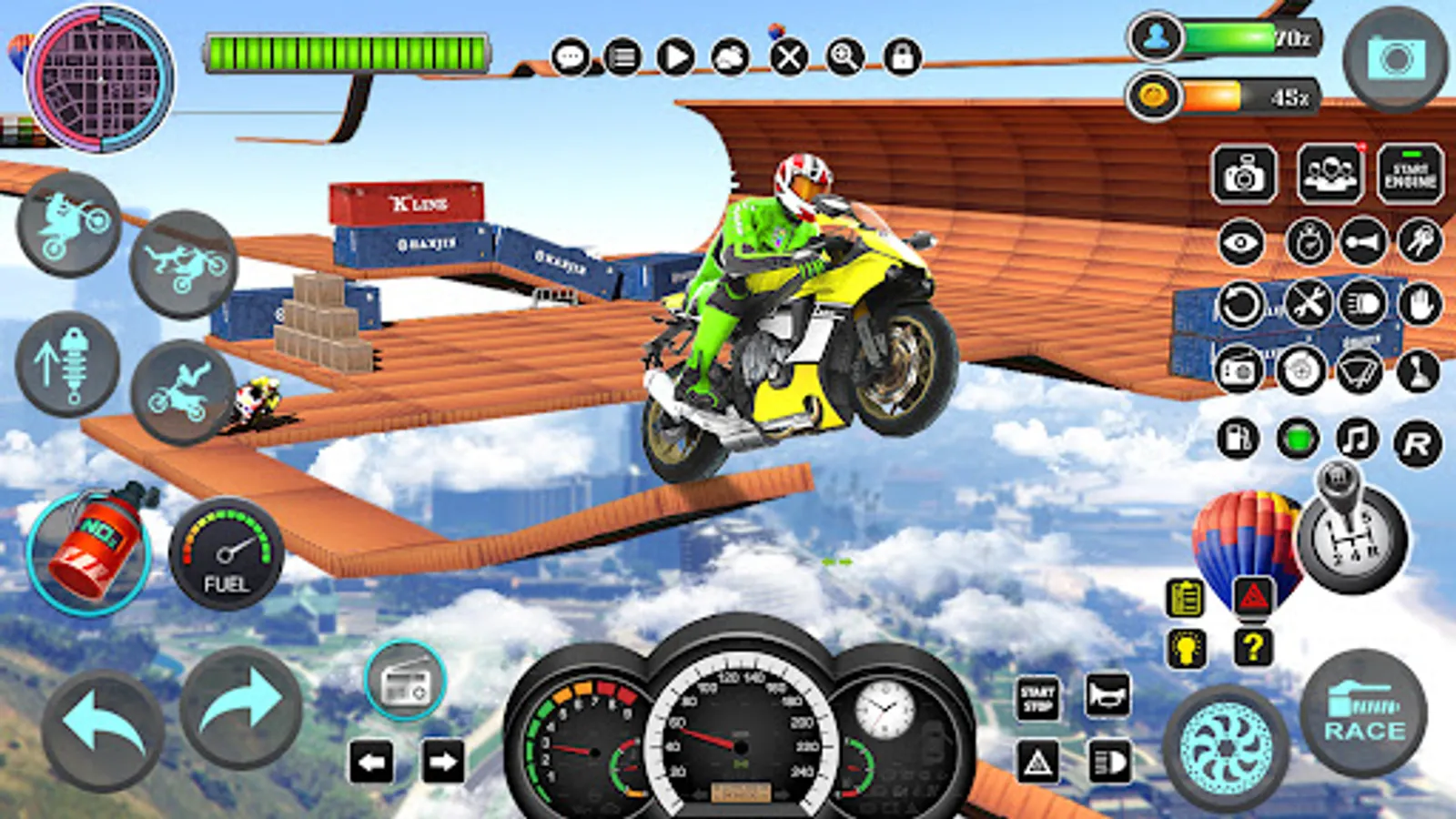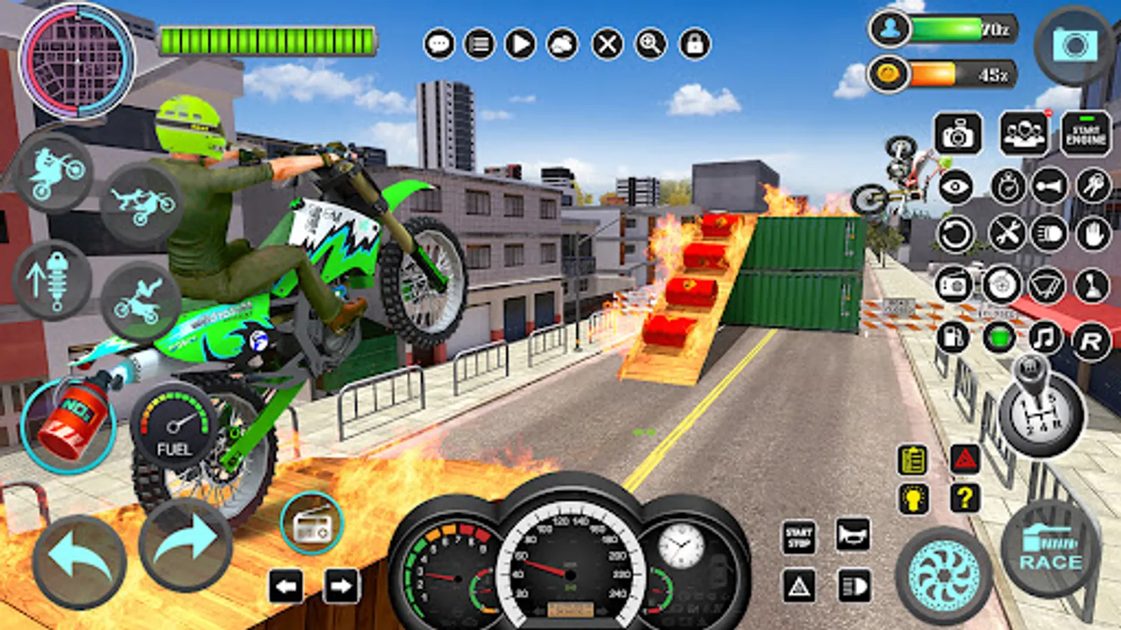 Playing city superhero bike racing simulator 2018 is always fun, but it is more important to become the real moto rider bike racer champion and dominate all the levels in this city superhero motor cycle racing driving simulator 2017. In mega ramp stunts speed bike rider driving game 2018 there are two modes to play i.e stunts mode and the racing mode. Master your skills in mega stunt bike riding and race against time and then challenge opponents in real motor cycle races which you have learned in real bike games.