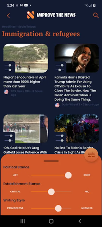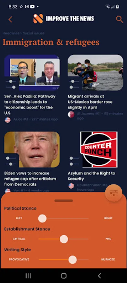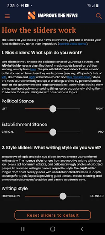 Just as it’s healthier to choose what you eat deliberately rather than impulsively, it’s more empowering to chose your news diet deliberately with this app rather than to randomly read what marketers and machine-learning algorithms elsewhere predict that you’ll impulsively click on. You can make these deliberate choices about, stance, style, etc. by adjusting sliders, for 544 topics. Sliders make it quick and easy to find alternative viewpoints and become aware of how various media outlets bias coverage in different directions. This app was built on the belief that filter bubbles harm democracy, and that society benefits when we can understand other people's points of view.