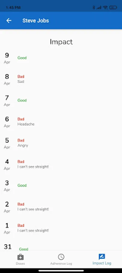 This adherence log will provide a user-friendly interface displaying the history of all medication events and associated adherence. This includes - early, late, or missed doses. Impact logging capabilities will provide individuals and their caregivers with the ability to effectively communicate how they are feeling from their medication regimens!