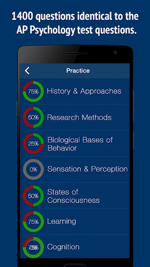 AP Psychology practice exam simulator is a free ap psychology exam prep app for Advanced Placement Psychology examination. It is a complete AP psychology study guide to prepare you for actual ap psychology exam by taking AP psychology practice exam , studying ap psychology flashcards and mock test. This application is designed to take AP psychology practice exam on the go without internet on your mobile device. This AP psychology practice exam prep app record you performance and highlight the weaker area to let you focus on them while studying for ap psychology exam. All questions are formulated by experts closer to the actual ap psychology exam.