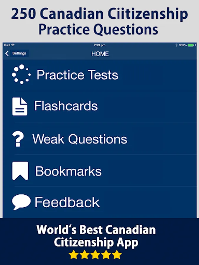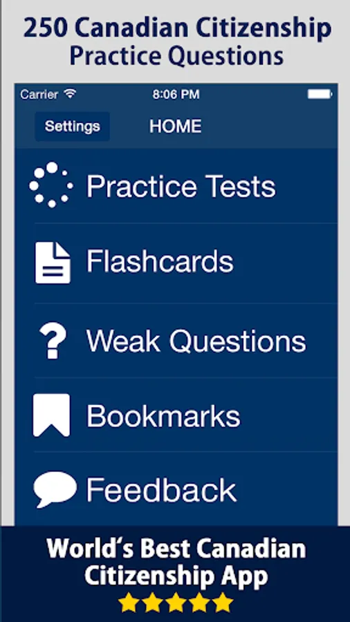 To gain the status of a Canadian Citizen, you need to pass the Canadian Citizenship test. This free citizenship quiz can help you pass your test. All the questions answers included in mock tests are being chosen very carefully closest to the real test. With more than 250 actual questions based on the official study guide "Discover Canada", you will learn about Canada's history and geography, economy, symbols, justice system, governing system, and the rights and responsibilities of being a Canadian right here on your device. This app can greatly speed up your learning and save a lot of time.