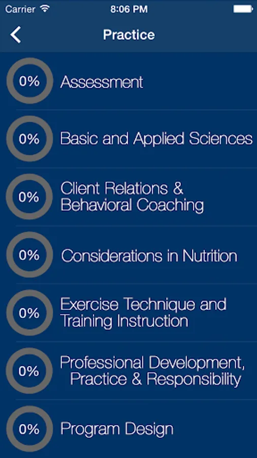 NASM CPT enables you to take all the questions regardless the categories or take them by each category separately. Some of the categories are: Basic exercise science, balance training, behavior modification, cardiorespiratory training, core training, fitness assessment, flexibility, human movement science, integrated training, nutrition, and professional development.