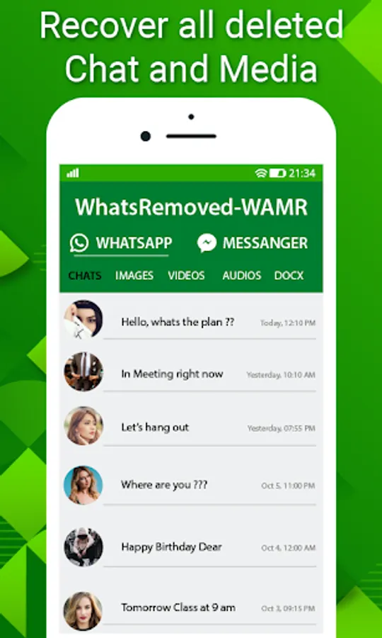 Maybe it will be annoying if a friend, relatives or anyone deleted messages, animations, videos, GIF, images, audio memos or other media before viewing them! Don’t need to worry that you just found the best app for recover deleted messages, WAMR - Deleted Message Recovery & Status Saver.