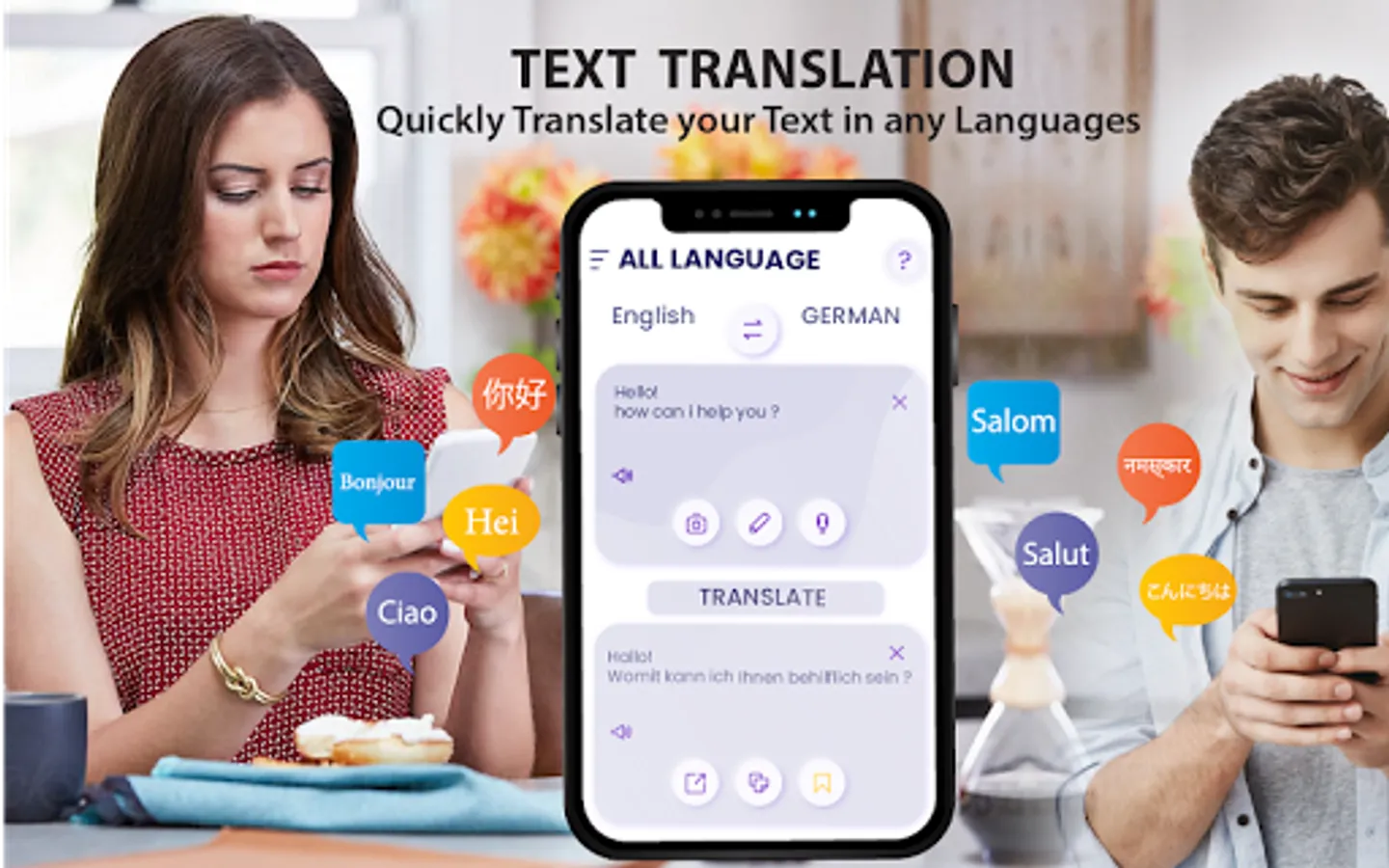Language free translator permit to speak and listen in simple voice translation conversation which allows you to take notes easily from conversation or speaking translator. All Language Translator supports voice, text, camera, conversation and quick translation, dictionary, inspirational quotes of famous personality with word pronouncer in more than 100 languages all over the world. You can use it all over the world for business and education and also for travelling. Learn and teach by fast translation feature that is easy native languages with from all languages translation app and also learn Russian language or Italian language or Spanish using easy free language learning app.