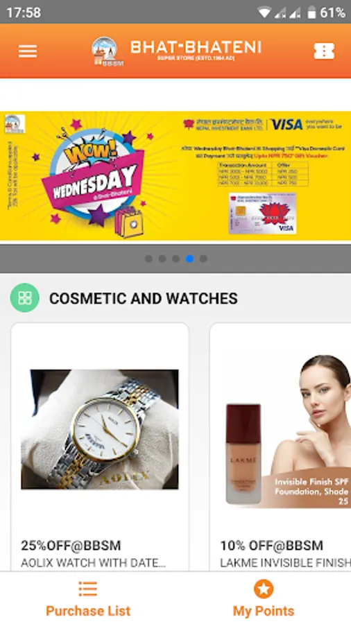 Bhat-Bhateni Supermarket and Departmental Store (BBSM) Loyalty app provides information about: