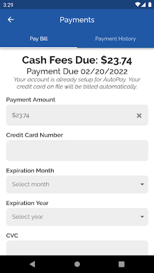 • Pay your bill online via credit card and view previous online payments