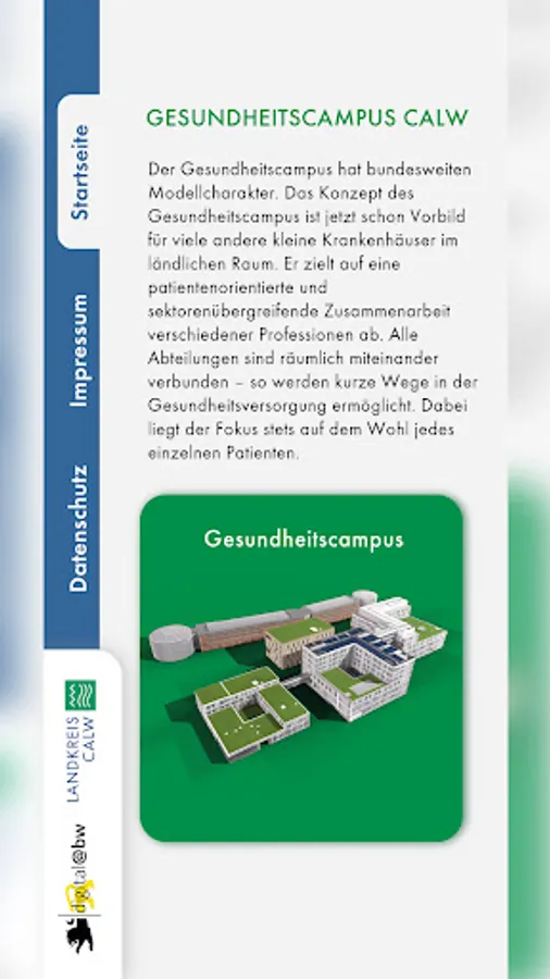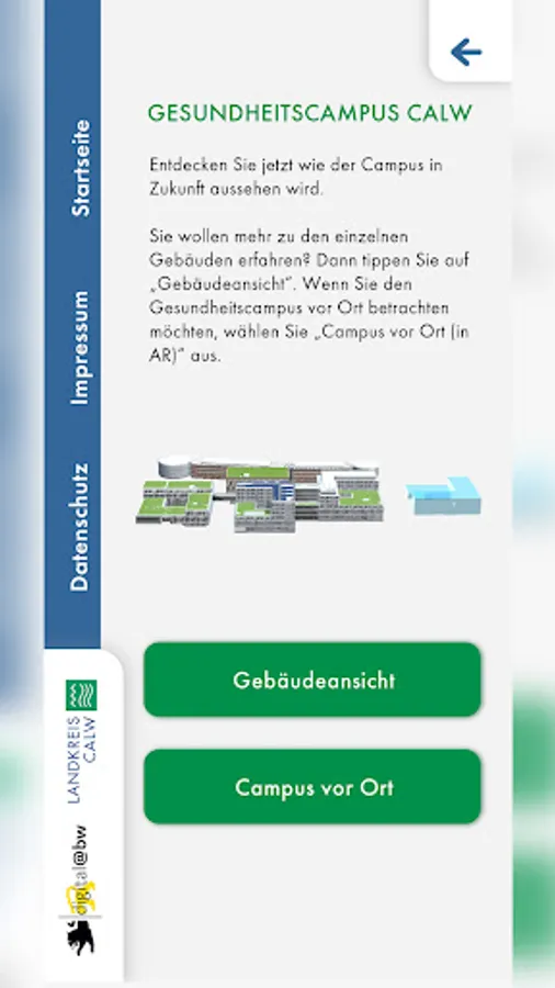 The district of Calw has developed an app for mobile devices for active citizen participation in municipal construction projects. With the help of augmented reality, we want to give the citizens the opportunity to see the buildings before they are completed. For example, interactions with the environment can be better simulated. The current presentation of the Calw health campus is a first step in the digital presentation of municipal construction projects.