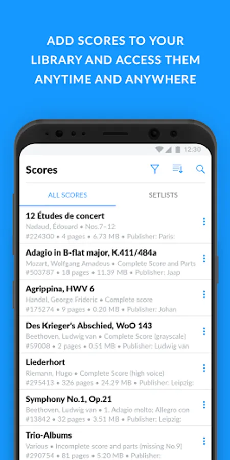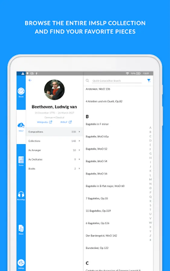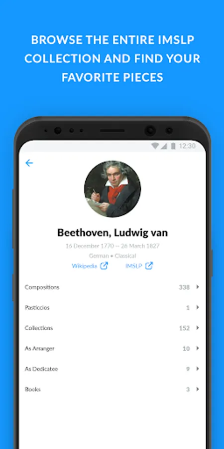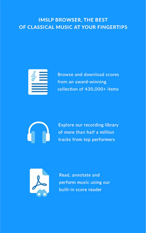 The IMSLP app allows you to browse the award-winning IMSLP / Petrucci Music Library, the largest free online sheet music library in the world, and to create your own library of scores and recordings.
