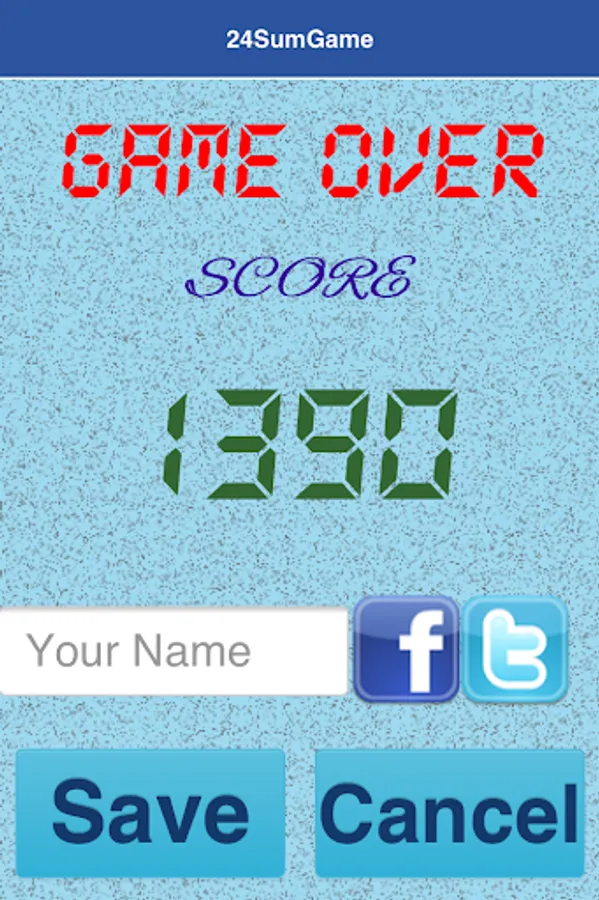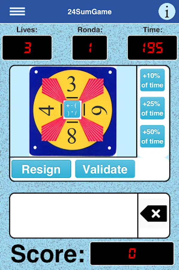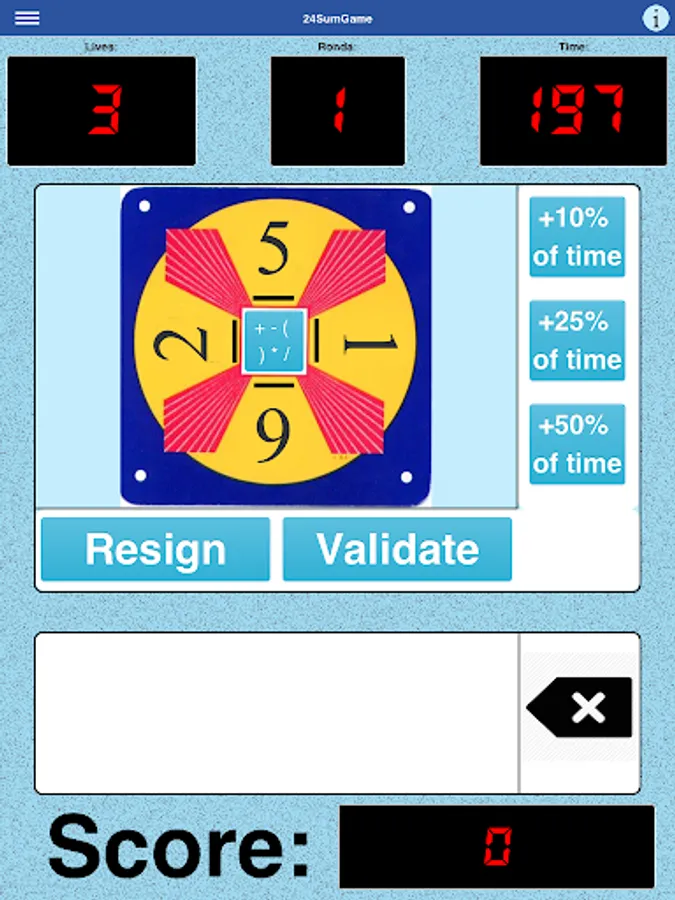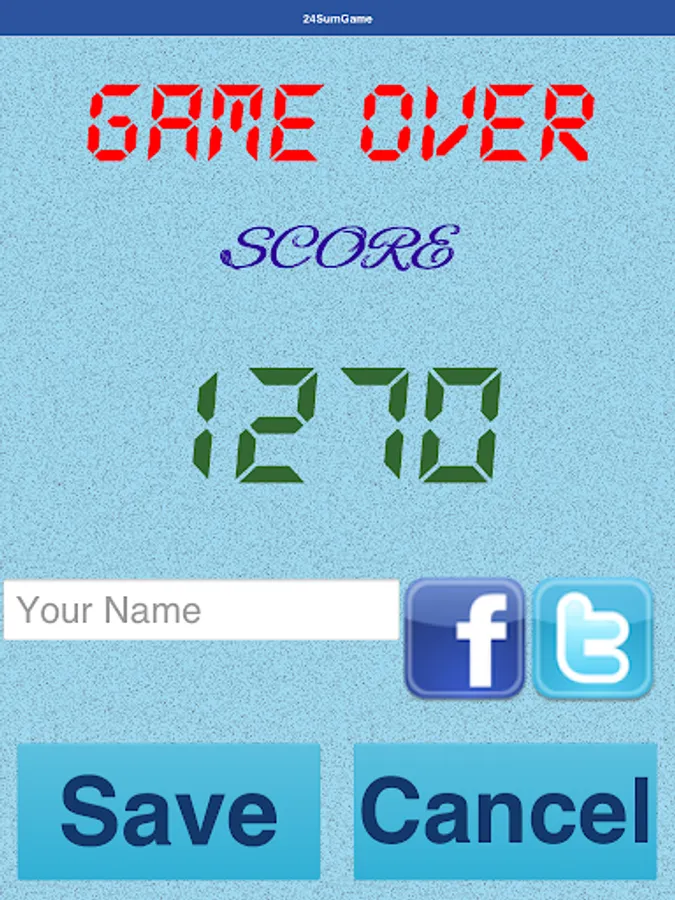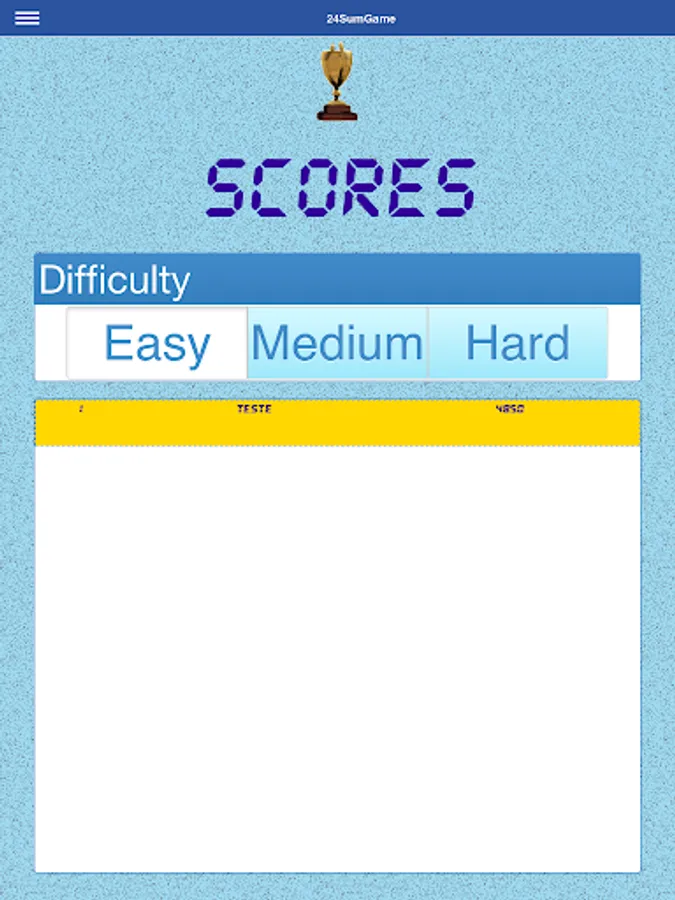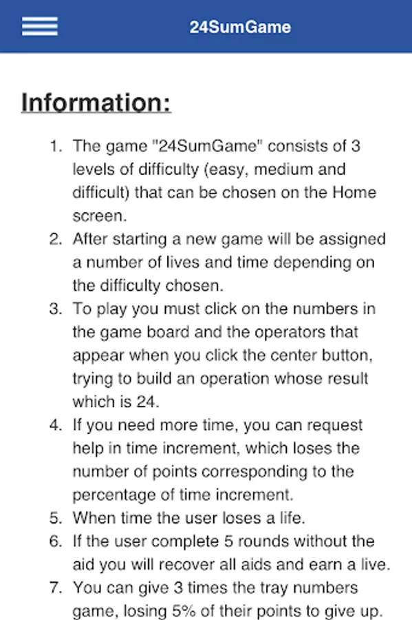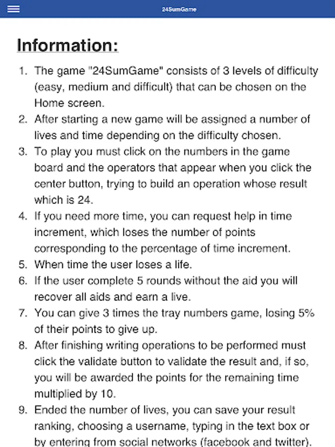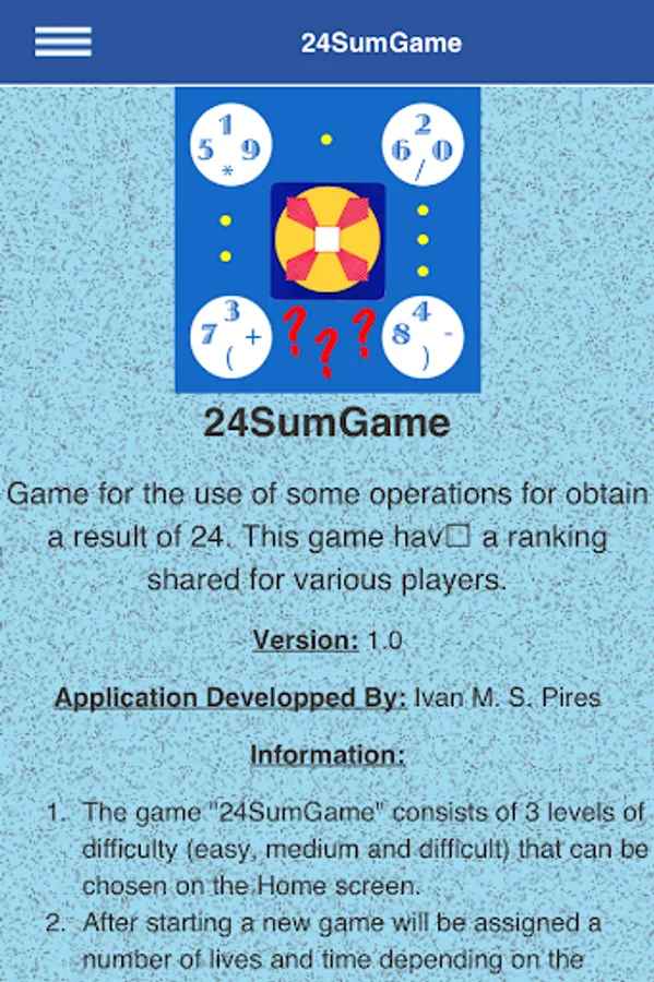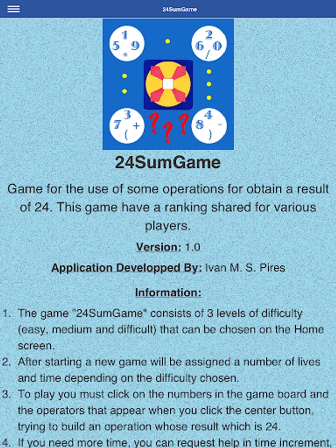 The game "24SumGame" consists of 3 levels of difficulty (easy, medium and difficult) that can be chosen on the Home screen.
