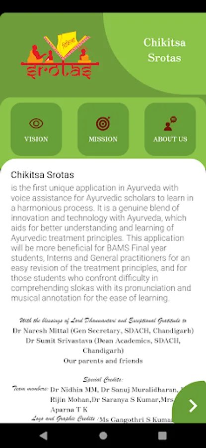 Chikitsa Srotas is the first unique application in Ayurveda with voice assistance for Ayurvedic scholars to learn in a harmonious process. It is a genuine blend of innovation and technology with Ayurveda, which aids for better understanding and learning of Ayurvedic treatment principles. This application will be more beneficial for BAMS Final year students, Interns and General practitioners for an easy revision of the treatment principles, and for those students who confront difficulty in comprehending slokas with its pronunciation and musical annotation for the ease of learning.