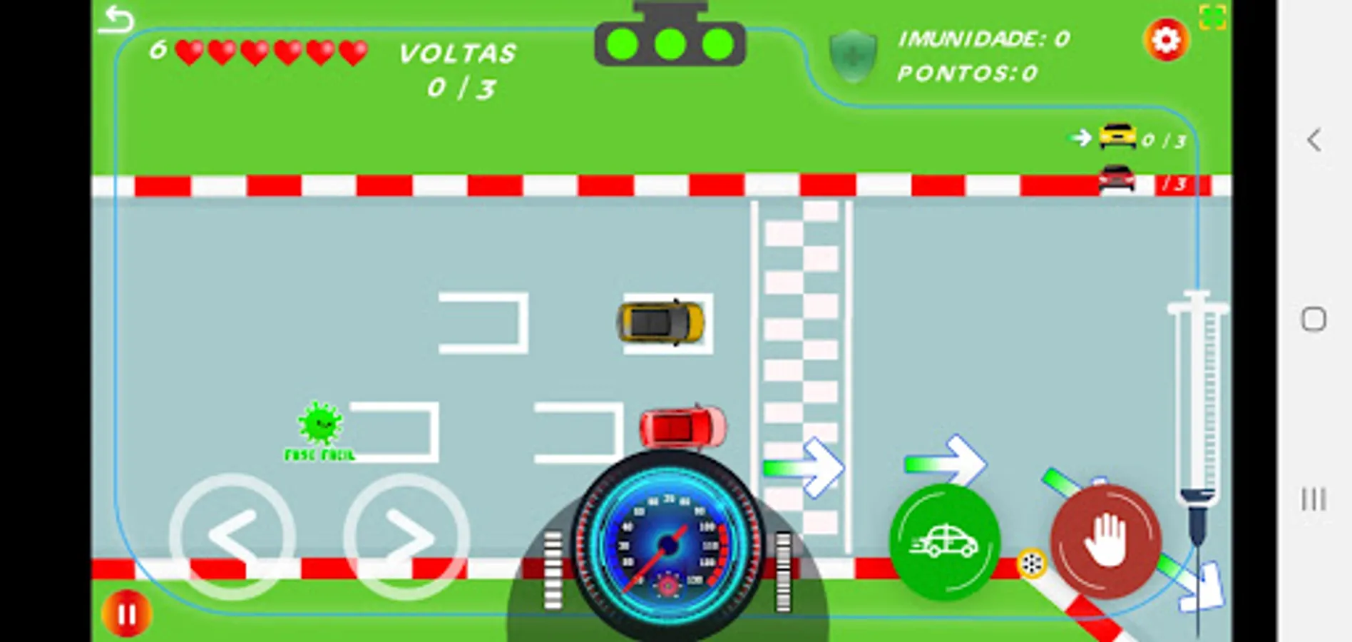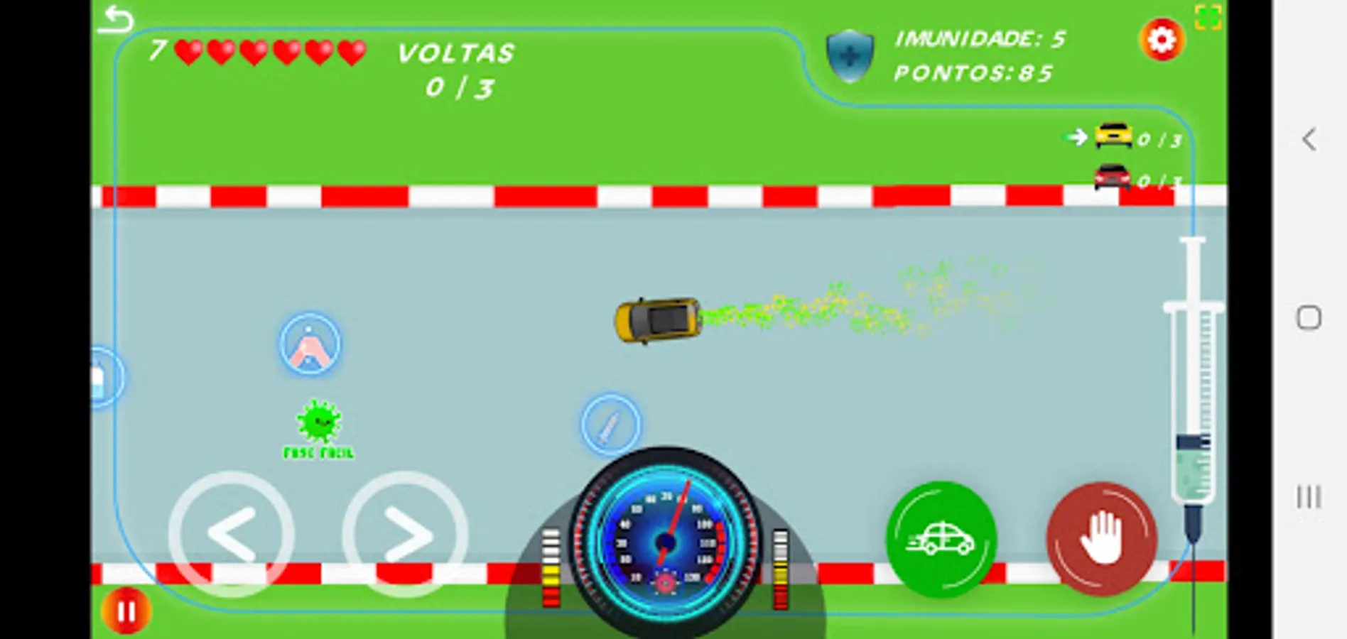 All stages contain a number of opponent cars and several viruses spread around, use the drive thru to be immunized and gain speed. each drive thru you do, you gain 1 life, if the immunity is active you will not be able to enter the drive thru again until the effect ends.
