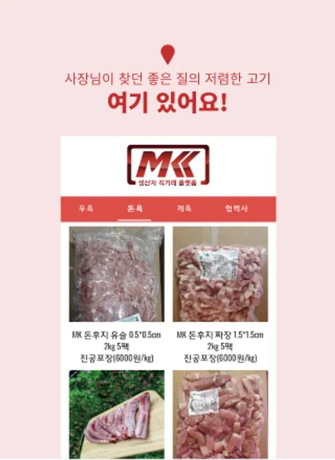 With Korea's largest meat processing technology and distribution power to import delicious and inexpensive meat, we thought of doing business with leading companies, large franchises, and small businesses in Korea. “Can’t we reduce distribution margins and provide quality meat at a lower price?” What if the numerous distribution processes from the store to receiving the meat were reduced and the producers and buyers were directly connected? “MK Livestock Market” was born from the idea of providing better products to customers.