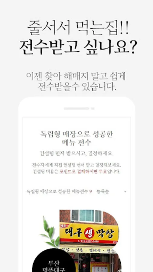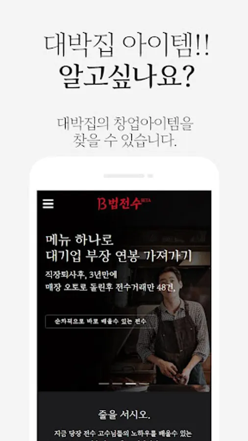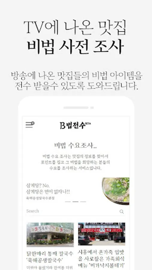 언론매체에 나온 유명 맛집의 비법을 전수받고 싶으신가요? 그럼 비법수요조사에 신청해보세요. 비법 신청자들이 5명 이상 모이면 B법전수에서 찾아가서 전수 프로그램과 전수가격 절차 등, 준 프랜차이즈 조건을 협상하고 오겠습니다.