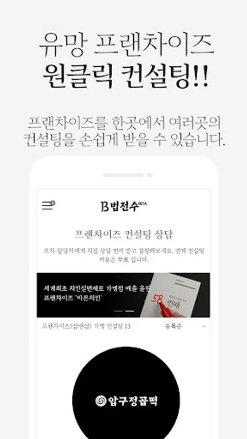 B법전수에서는 창업이 처음이라 물류까지 제공해주는 창업 시스템이 필요한 예비 창업자에게 손쉽게 프랜차이즈 컨설팅을 연결해주고 있습니다.