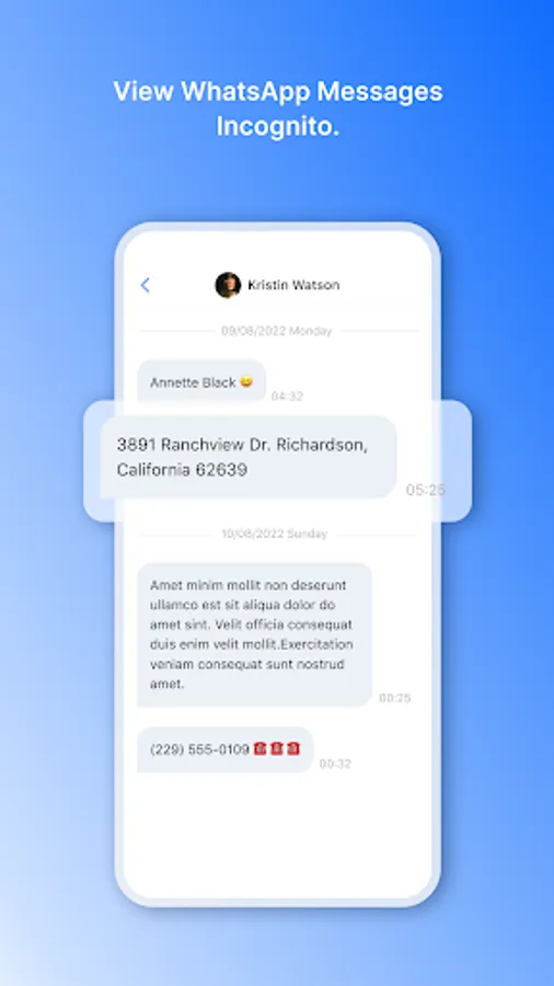 ChatsBack is a WhatsApp message recovery app to recover deleted WhatsApp messages from deleted senders without backup, you can also recover deleted WhatsApp photos/videos/files/voice/contacts. You can view deleted WhatsApp messages without the sender's knowledge and there is no incognito blue tick on ChatsBack, including viewing recalled WhatsApp messages.