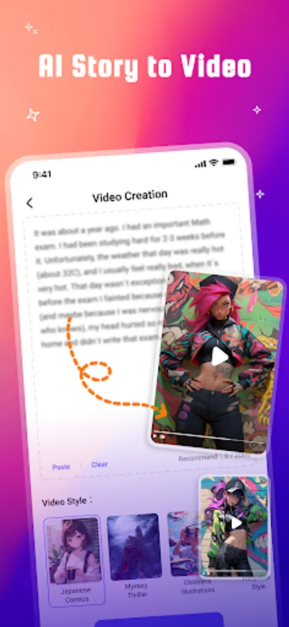 It's not just a paste-and-convert process. Use it to generate a story or rewrite text from the idea you input, choose the style you like, then turn the generated story to an original video. Use Novi AI to convert text to video now!