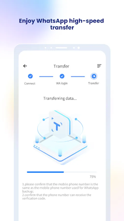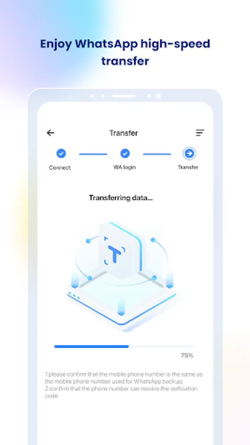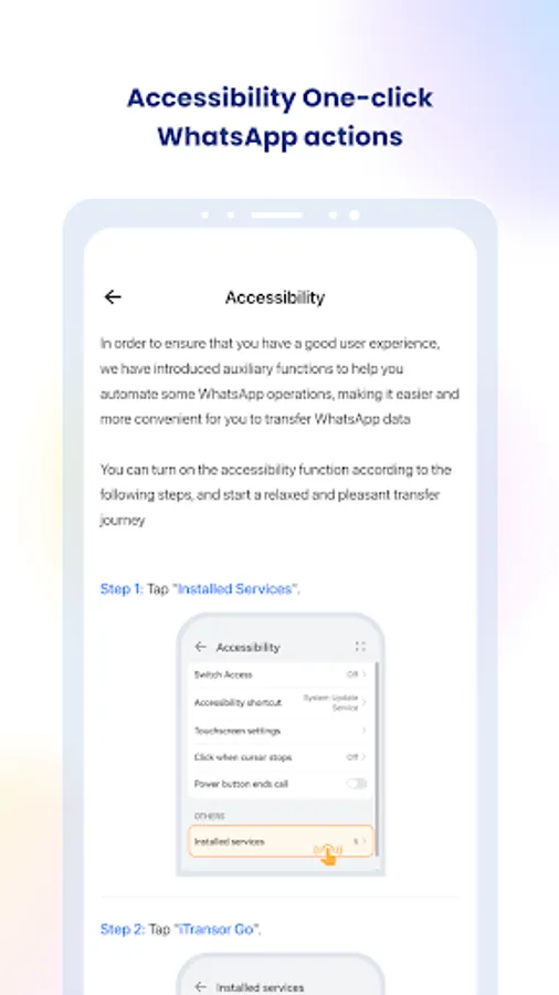 In order to provide you with an easier and smoother WhatsApp data transfer experience, we have come up with an automated accessibility feature. The accessibility function can automatically help you complete WhatsApp backup and turn off WhatsApp two-step verification, and the operation of the accessibility function fully follows the rules of WhatsApp. In addition, we attach great importance to the security of your data, all your data will only be used for transmission, iTransor will not save or share your data with others.