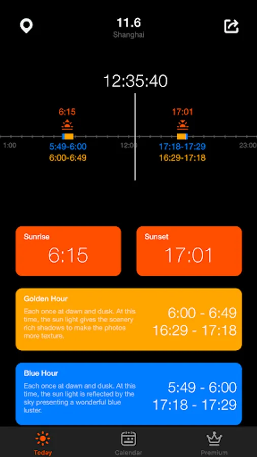 - Precise Time: Sunrise and sunset, golden hour, blue hour, moon phase